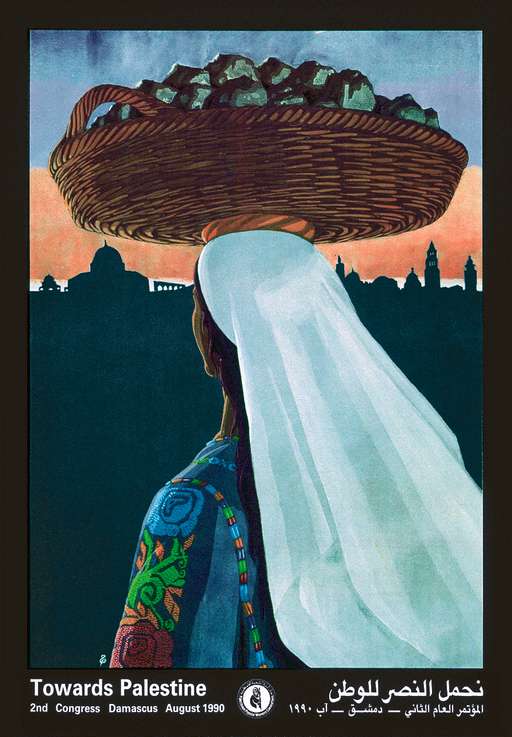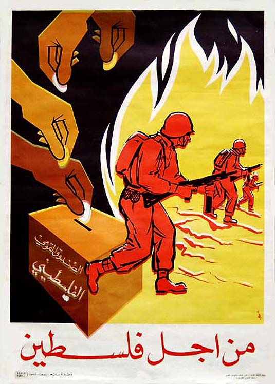 Um ano após a sua fundação, em 1964, a OLP (Organização para Libertação da Palestina) publica sua primeira coleção com quatro cartazes. Os cartazes foram encomendados para o artista gráfico Ismail Shammout. Nesse cartaz de 1965, mãos depositam dinheiro em uma caixa onde se lê “Fundo Nacional Palestino”. E em vermelho “Pela Palestina”.
