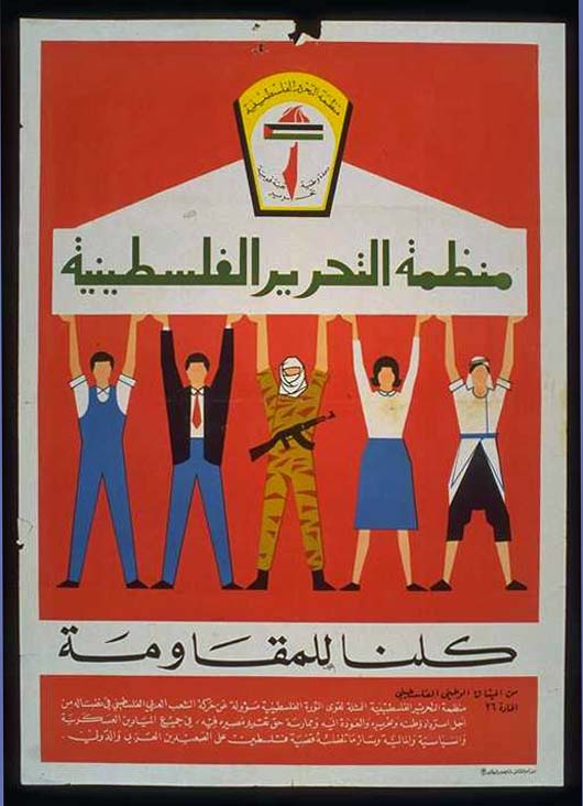 Esse segundo cartaz faz parte da coleção inicial da OLP encomendada a Ismail Shammout. A ideia do cartaz era popularizar o logo da OLP, que aparece em cima, no centro do cartaz. Em verde está escrito “Organização para Libertação da Palestina”, sustentado como um tempo grego em que as colunas são representadas por pessoas de diferentes classes sociais. Abaixo, em preto, lê-se “Somos todos pela resistência”.