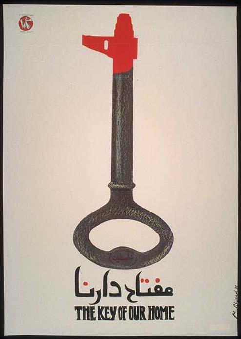 Como resultado da criação do Estado de Israel e do início da limpeza étnica promovida pelos sionistas, cerca de 800 mil palestinos foram expulsos de suas terras e cerca de 500 aldeias foram destruídas. Muitos desses que foram expulsos levaram consigo as chaves de suas antigas casas. Guardadas até hoje, as chaves se transformaram em símbolo do direito ao retorno e da resistência palestina. Nesse cartaz publicado em 1983 pelo Fatah (Movimento de Libertação Nacional da Palestina), uma chave é representada com a ponta de uma metralhadora. Logo abaixo está escrito: “A chave de nossa casa”, colocando a necessidade da luta armada para garantir, de fato, o direito ao retorno às terras natais.