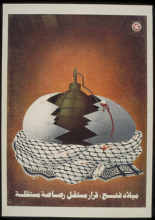 Esse cartaz de 1983 comemora a fundação do Fatah. Uma granada nasce de um ovo chocado em um ninho de kuffiyeh [lenço tradicional palestino] onde também há algumas penas ensanguentadas. No texto: “Nascimento do Fatah: uma política independente é uma munição independente”.