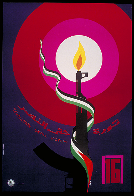 Cartaz comemorativo dos 16 anos da política de luta armada do Fatah. Um fuzil representado como uma vela ilumina o cartaz. Enrolada no fuzil, uma bandeira da Palestina faz um movimento esvoaçante para cima. No texto: “Revolução até a vitória”. O cartaz é de Ismail Shammout.
