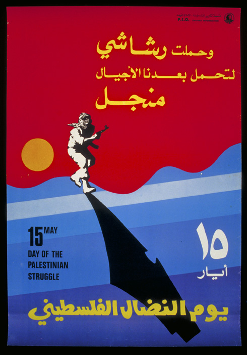Cartaz de 1976, também do Fatah, publicado em ocasião do 15 de maio, a Nakba. Em árabe: “Eu carreguei uma arma para que as próximas gerações carreguem uma foice”. Na imagem um combatente palestino projeta a sombra da Palestina sobre o mar – provavelmente em uma referência à exigência de liberdade “do rio ao mar”. Carregar uma foice, no caso, deve ser interpretado como o direito à terra.