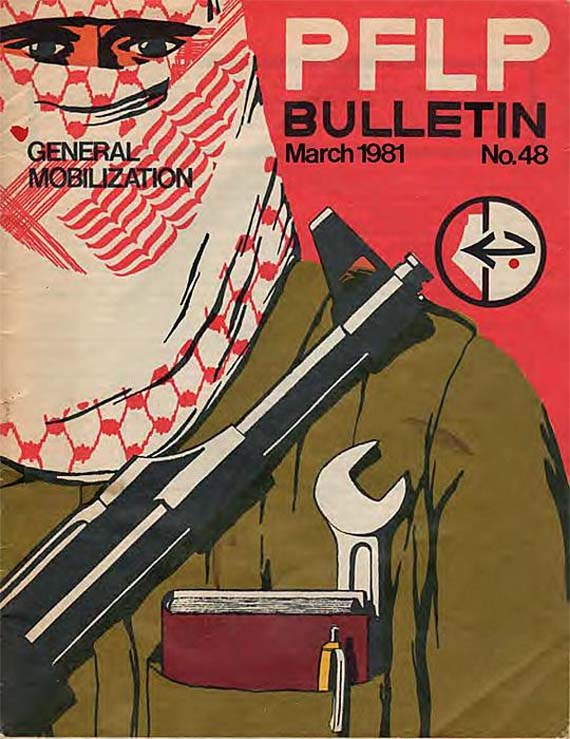 Capa de um boletim da FPLP (Frente Popular para a Libertação da Palestina) de 1981. Embora não seja propriamente um cartaz, os materiais da FPLP merecem destaque. Boa parte deles foram feitos pelo artista gráfico suíço Marc Rudin e são um capítulo à parte na memória gráfica da resistência palestina.