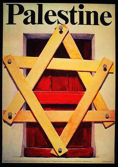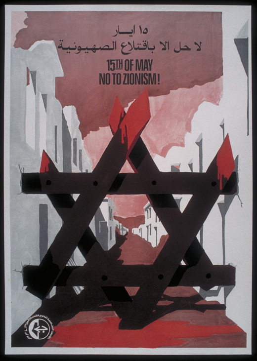 No cartaz, um vilarejo abandonado tem sua entrada bloqueada por estrela de Davi, também conhecida como Selo de Salomão. É um antigo símbolo reivindicado pelos judeus e está presente na bandeira de Israel. A estrela também é usada para representar o sionismo. No cartaz, a representação é a de que o sionismo impede os palestinos de voltarem para suas terras. No texto: “Não há solução a não ser destruir o sionismo”.