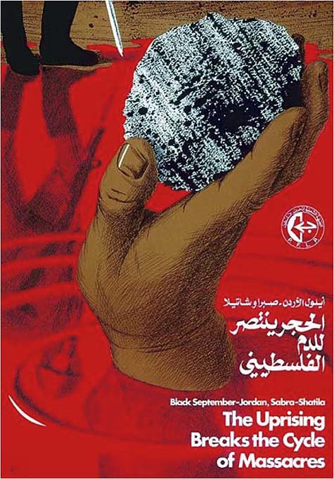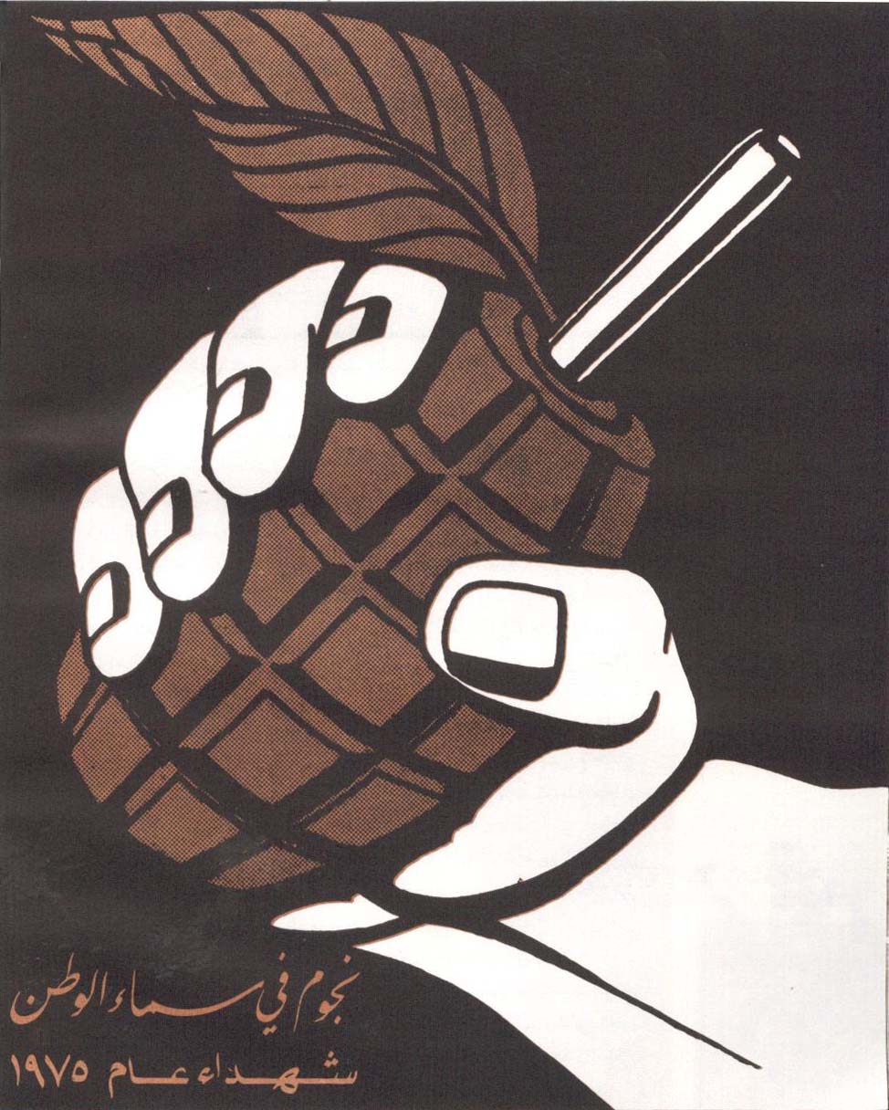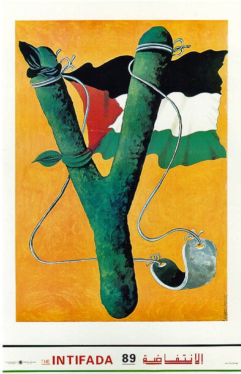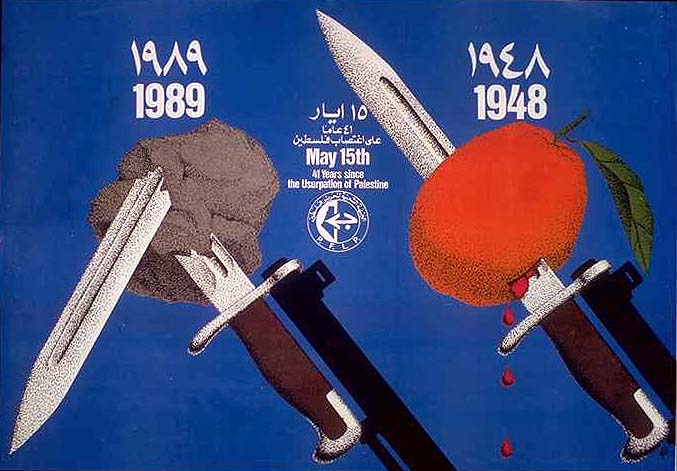 No cartaz azul, sangue escorre de uma laranja Jaffa perfurada por uma baioneta. A data – 1948 – refere-se à fundação do Estado de Israel e a baioneta à limpeza étnica sionista. À esquerda (à frente, portanto, já que árabes leem da direita para esquerda), uma baioneta é quebrada por uma pedra e a data é 1989. O artista se refere aqui à Primeira Intifada (1987-1993) que também ficou conhecida como Guerra das Pedras. O levante popular espontâneo começou em 1987 no norte de Gaza, no campo de refugiados de Jabaliyah, quando palestinos enfrentaram com pedras a repressão israelense. A pedra passou a ser o símbolo da intifada.