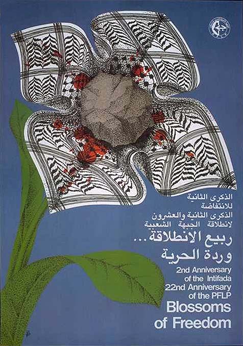 No cartaz azul: “Flores da liberdade”, uma pedra (intifada) nasce de uma flor com pétalas de kuffiyeh (lenço).